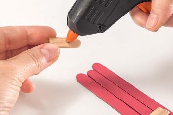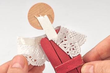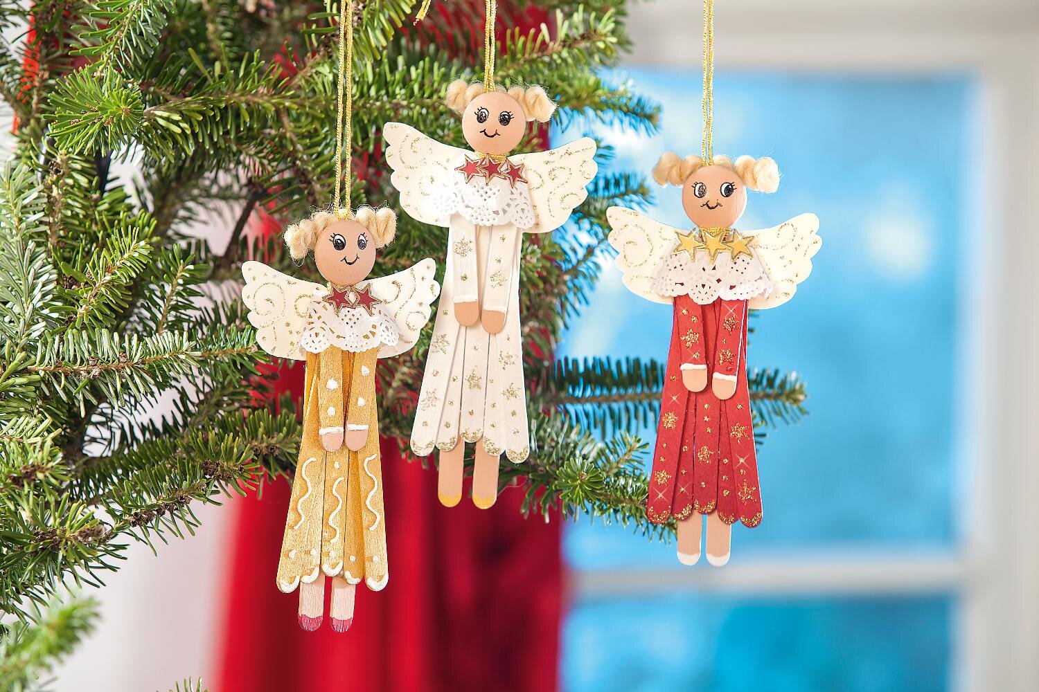 You can give the cute blonde Christmas angels to your friends or hang them on the Christmas tree. They are made of painted wooden sticks and have wings made of Paper. And here's how it works First you paint the wooden sticks and the boards. You need per angel - five coloured sticks - one skin coloured stick for the legs - one coloured stick with skin coloured ends for the arms. After drying, glue 3 coloured sticks together from behind with short pieces and two diagonally on top of them, this will be the dress. The short pieces you can easily cut with a side cutter. Stick one of these short pieces on as a neck and on top of it a plate as a head. Cut the stick for the arms in the middle and glue it on the dress. Divide the stick for the legs into two parts and glue them behind each other. Next, cut the lace paper in half and cut the pierced edge for the collar. Stick the tape-Ribbon on the edge and fix the collar around the dress. If the Paper is too long you can cut it off. On top of it you can add different stars. For this you stick relief stickers on Craft cardboard sheet, cut them out and then stick them on with tape-Ribbon Now you transfer the template for the wings onto embossed cardboard, cut it out and pull the embossed structure slightly with the glitter liner. To hang up the angels, wrap the golden Cord around your neck and fix it with some hot glue behind the board. Then you can also glue the wings with hot glue. Finally, you can decorate your angels with decorative snow liner and glitter liner, glue a piece of doll's braid on them and paint their faces with a fine felt-tip pen.