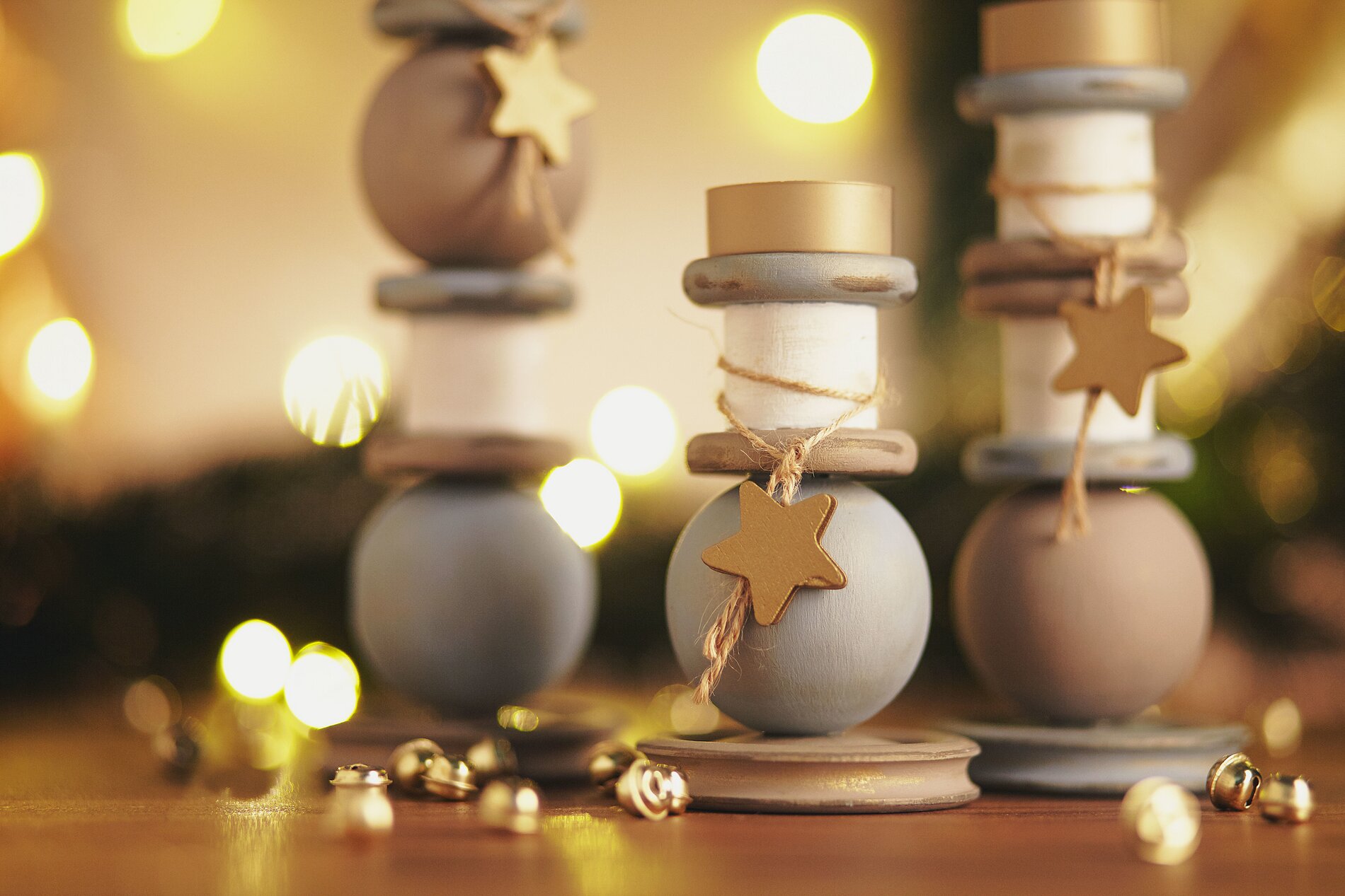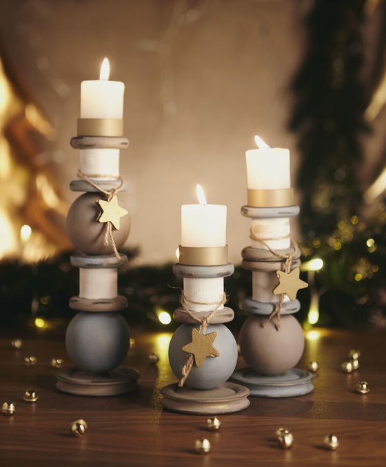 Paint balls, spools and wooden wheels with Chalky paint. Once the paint is dry, thread everything on wooden sticks and glue the parts together with Effekt Glue. Place a tea light plug on each candle holder and fix it with Effekt Glue.