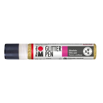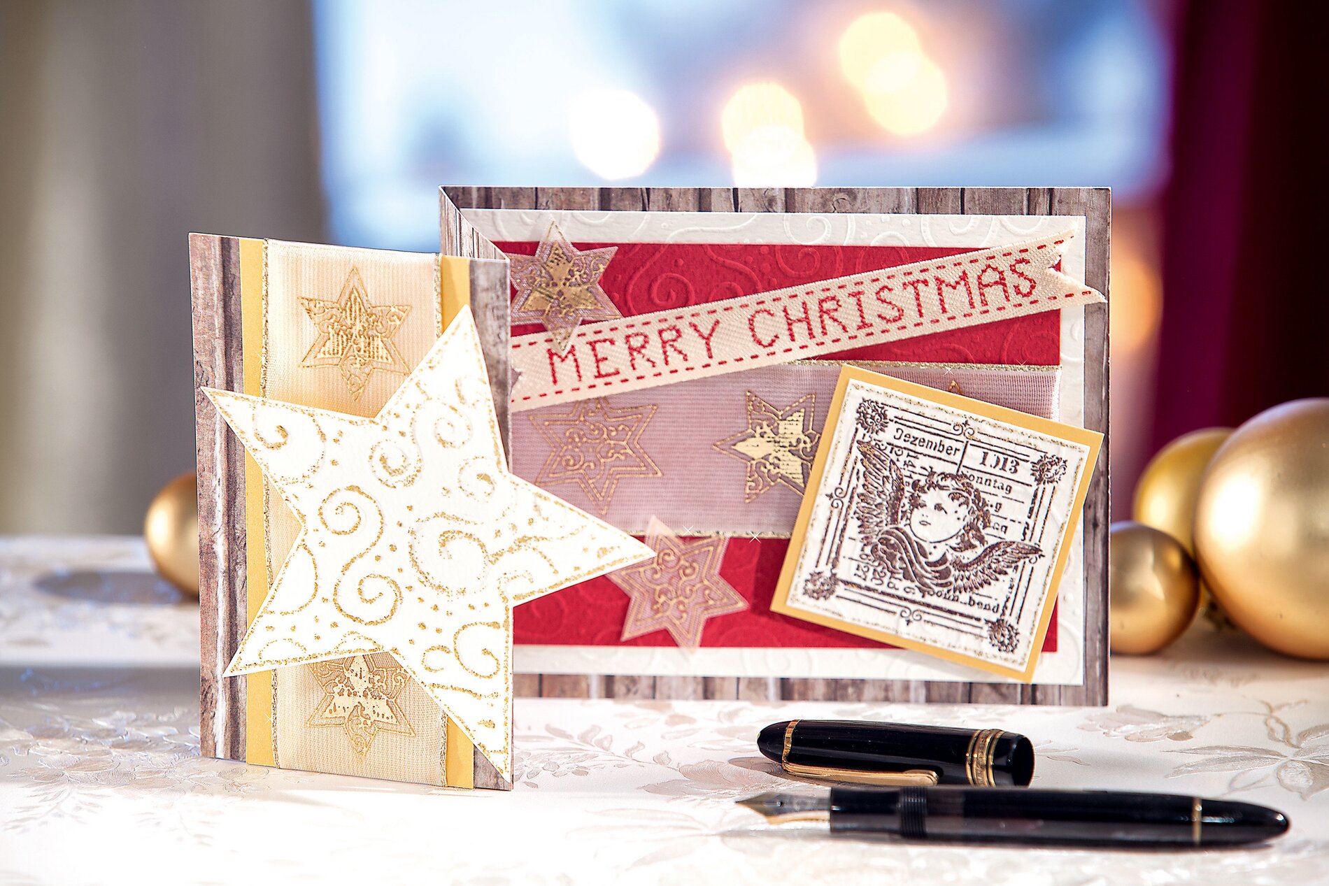 Glue a strip of golden photo cardboard on the front side , lay the ribbon tape over it and fix it on the back side with tape-Ribbon . Transfer the star from template sheet to embossed cardboard and cut it out. Emphasize the embossing of the star with glitter liner. Glue the star with 3D-Glue pads .