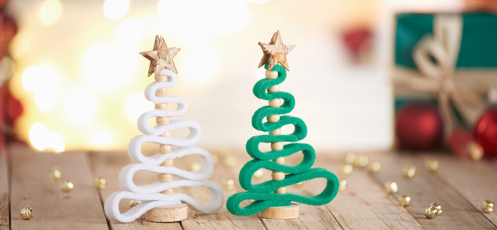 On an approx. 10 cm long piece of aluminium wire, the felt strip is alternated with Wood beads strung up into a Christmas tree. If it is Felt not so easy to pierce, Awl simply help with this. Once the top of the tree is reached, simply cut off the rest of the felt strips. Glue the wire at the bottom into the predrilled hole of the bark disc and decorate the top with a final star of both.