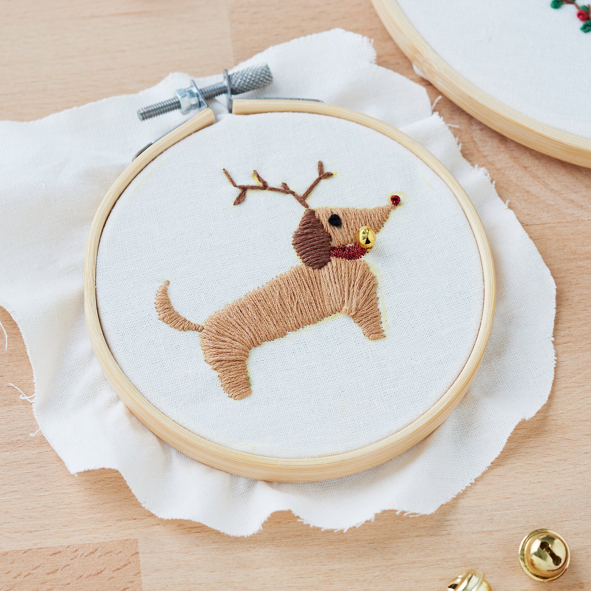 The so-called French knot is suitable for the more delicate elements such as the berries and the dachshund's nose. Insert the needle through the fabric from below, wrap the thread around the tip of the needle several times and then guide the needle back through the fabric. This creates a small, circular knot. Repeat this process until the element is complete and knot the thread securely on the underside.
