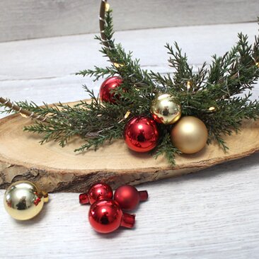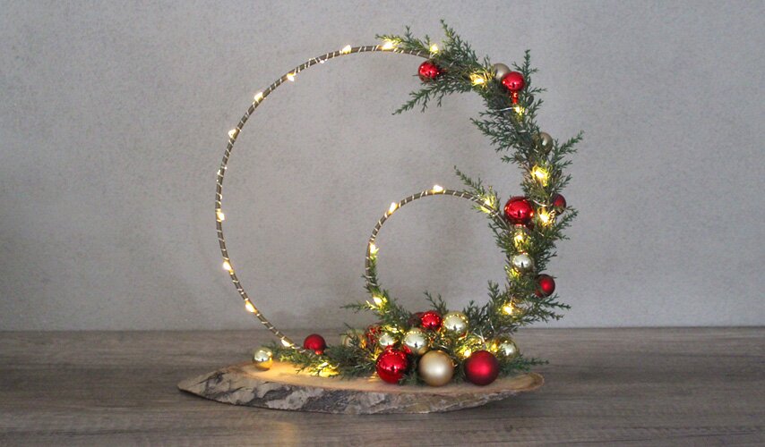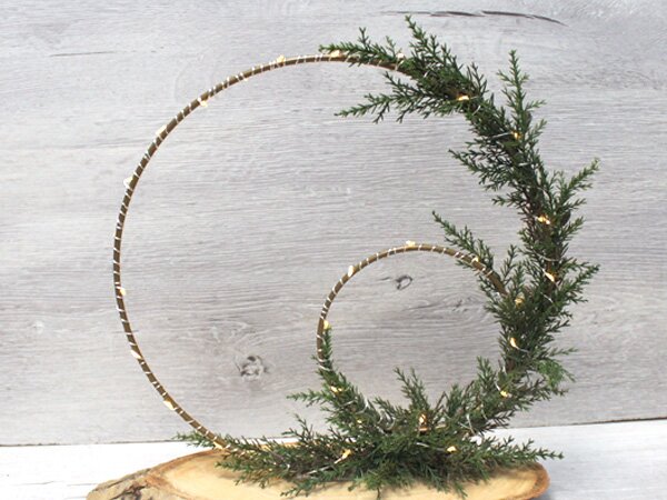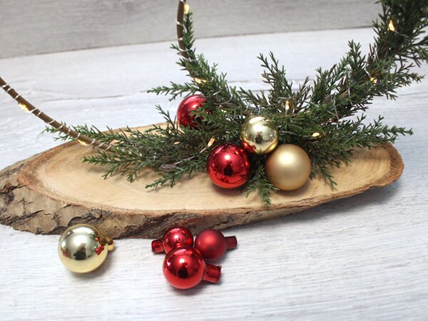 First use the twigs to hide the glue spot on the wooden disc and then glue the ring piece by piece. At the base, the branches can go in all directions. On the ring, you should only work in one direction.