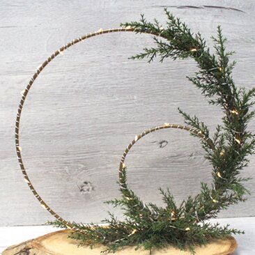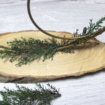 For the base, glue the metal ring onto the tree disc using hot glue. As long as the glue has not cooled down completely, you should support the ring. Then pluck the individual twigs from the bundle and remove the thick end.