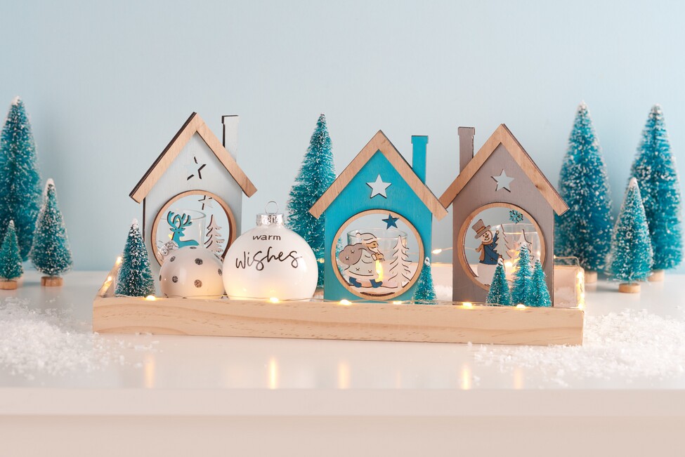 2. Now place the houses on the tray. You can also fix them with a little craft glue or hot glue. Then attach the fir trees to the tray with a little hot glue as well.