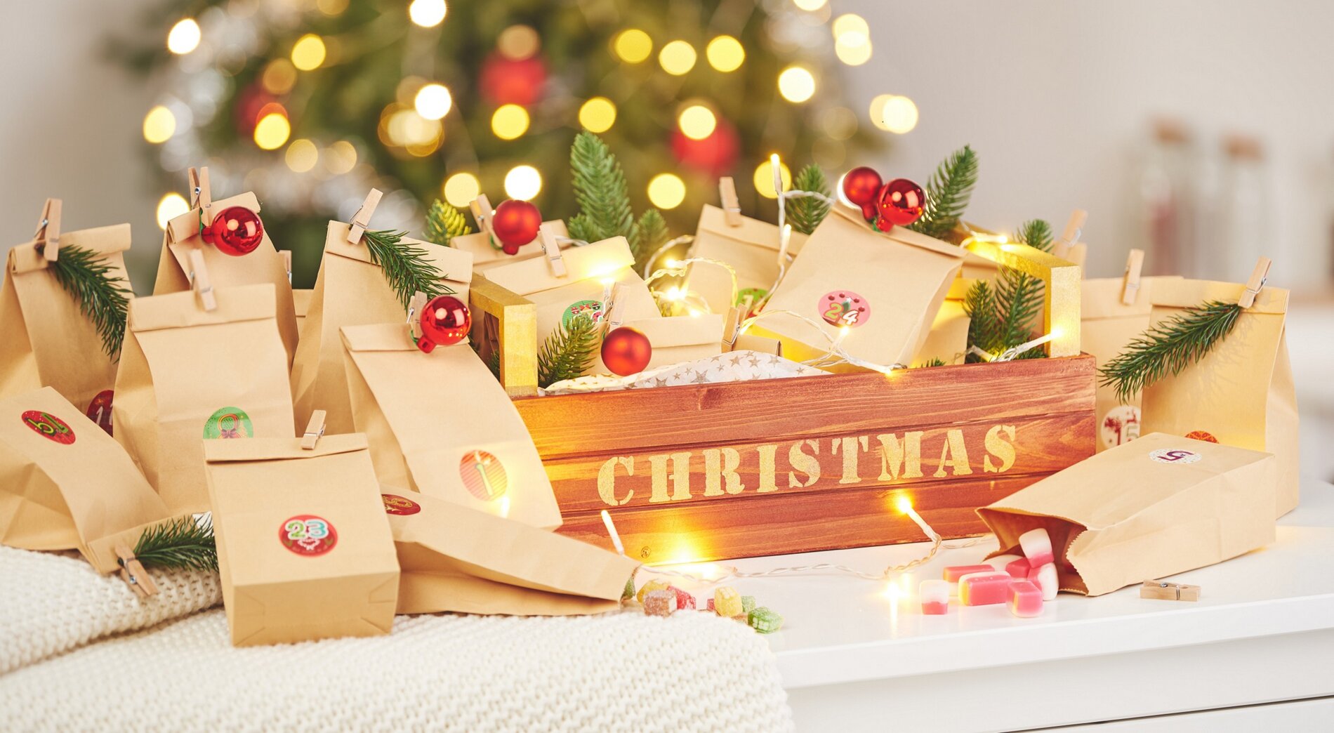 Stick the paper bags with the Advent number stickers. Fill the individual packages and decorate them with some fir greenery and red baubles.
