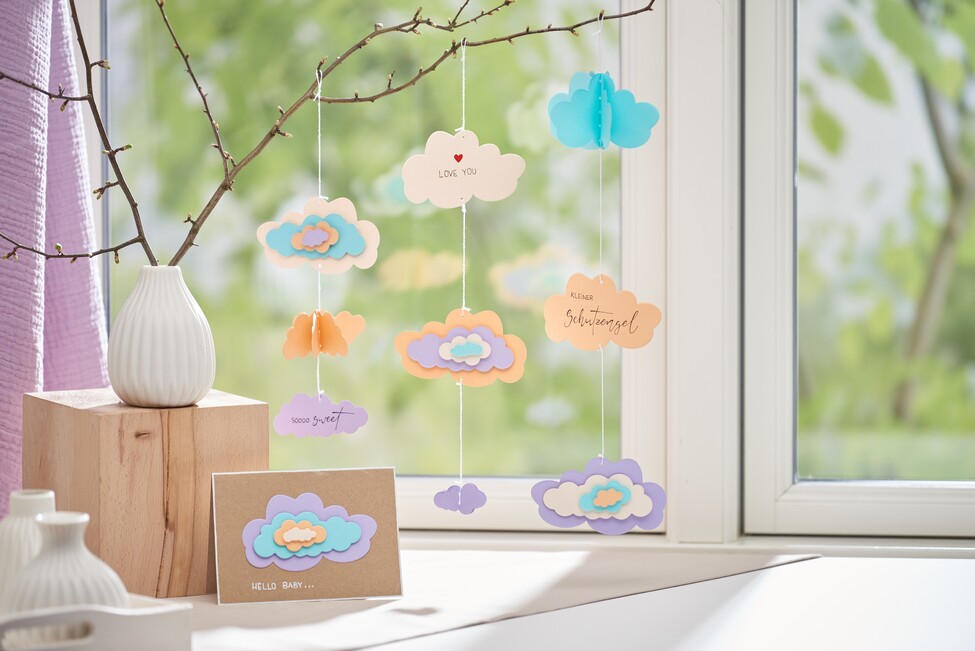 Add messagesDesign each cloud with a personal message. Use a permanent marker or pens of your choice for this. Whether inspiring words or loving notes - the lettering makes your mobile even more individual and personal.