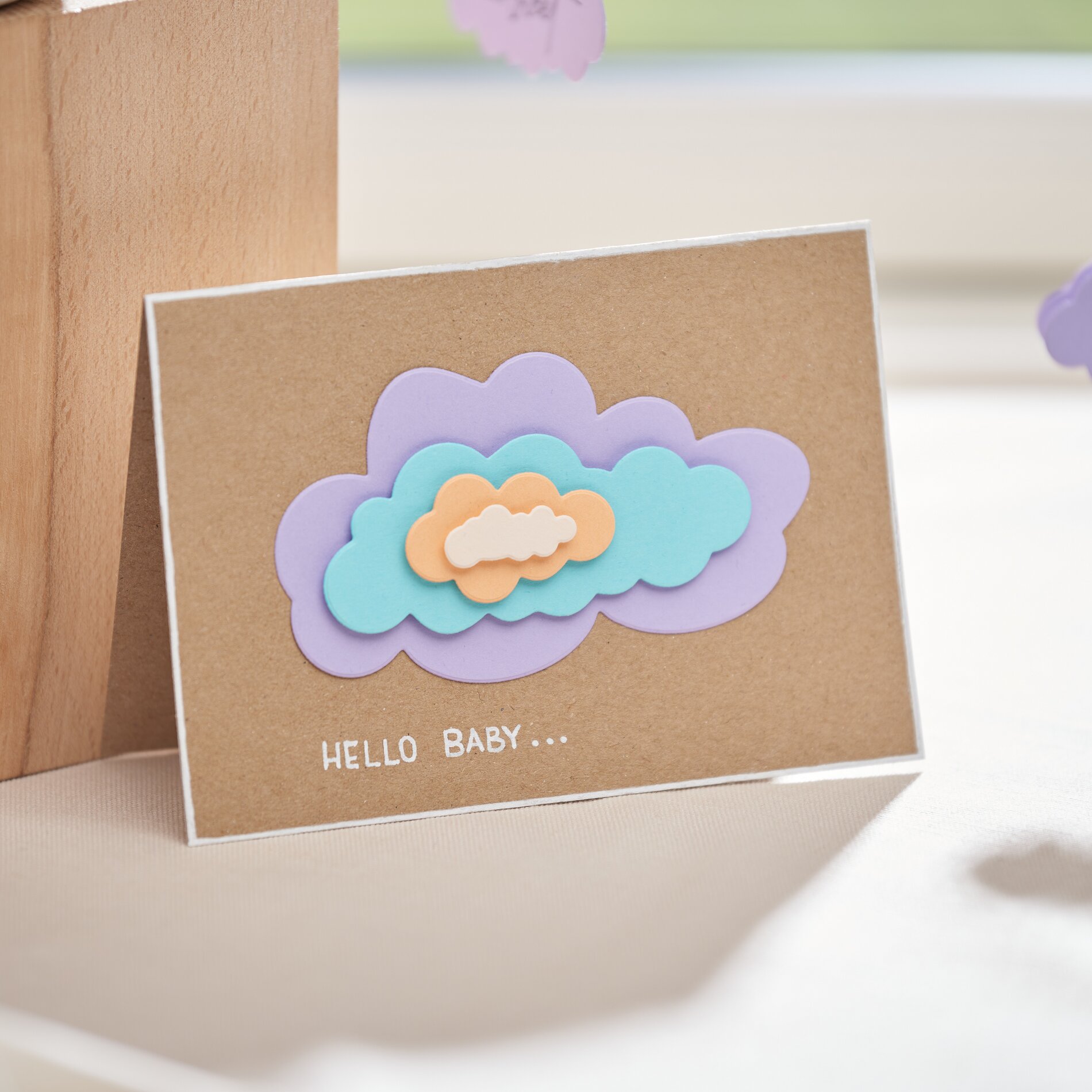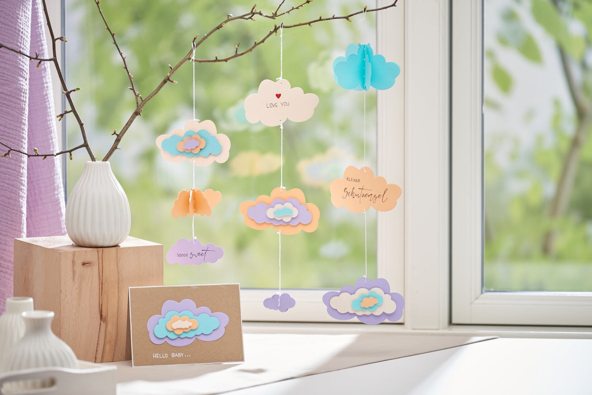 Start by punching the clouds. Use the punching template "Clouds" together with the Sizzix punching machine to create perfect cloud shapes. Try out three different variations to add variety and depth to your mobile. Using the Sizzix punching machine ensures precise and clean cuts.
