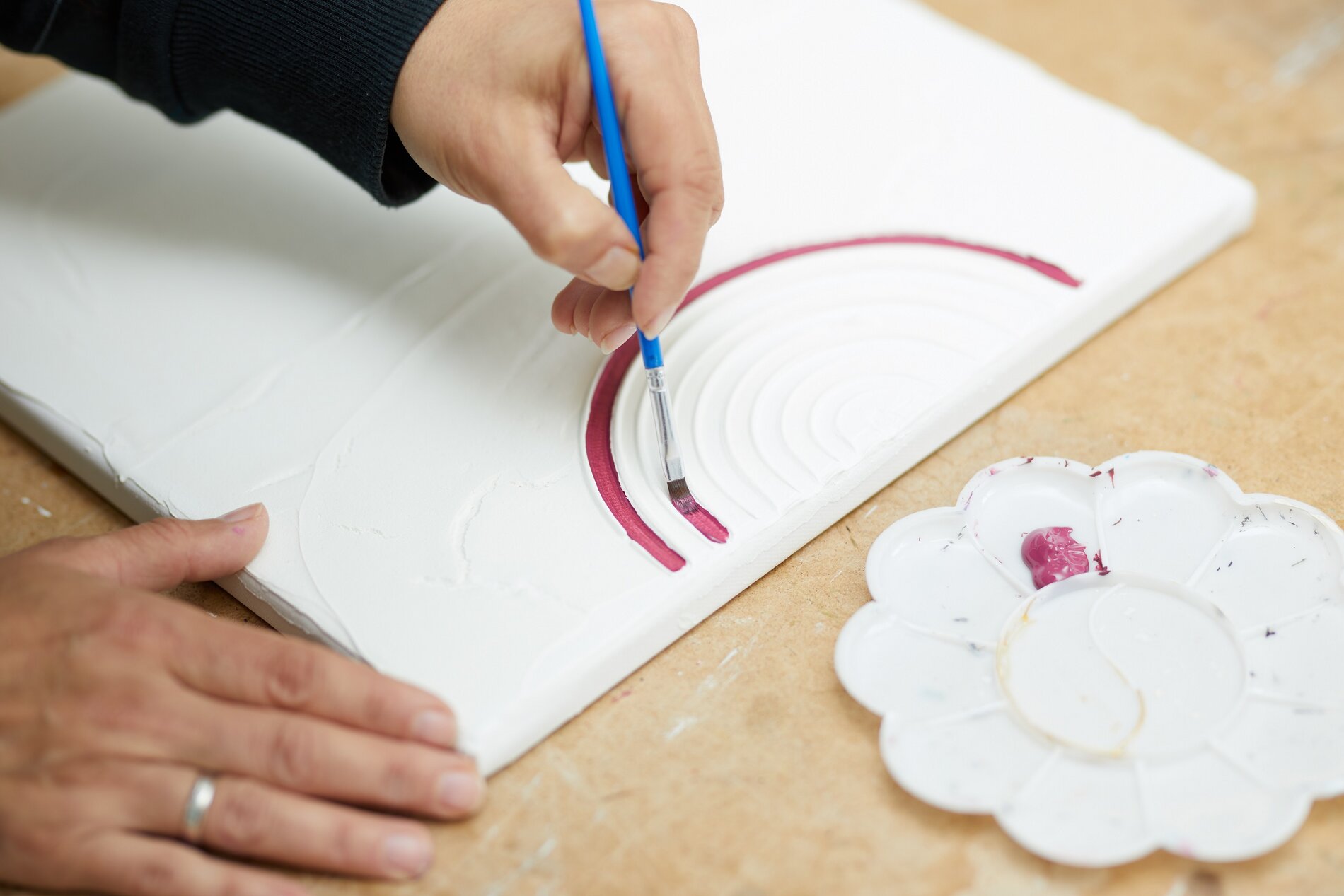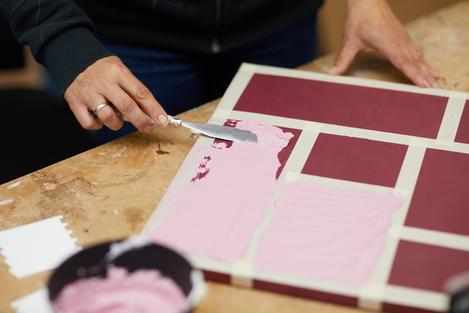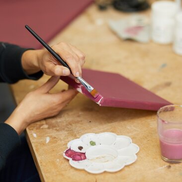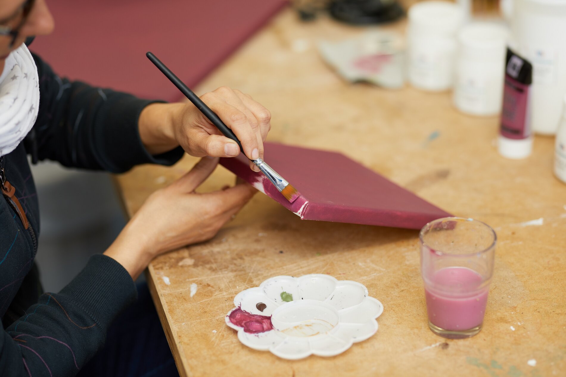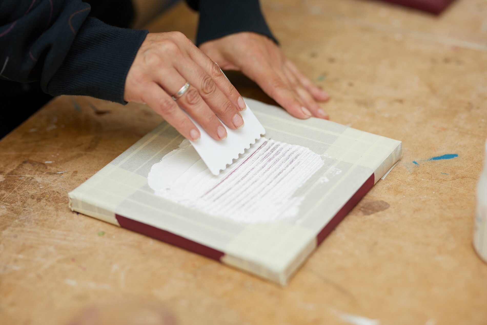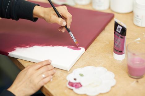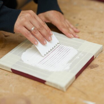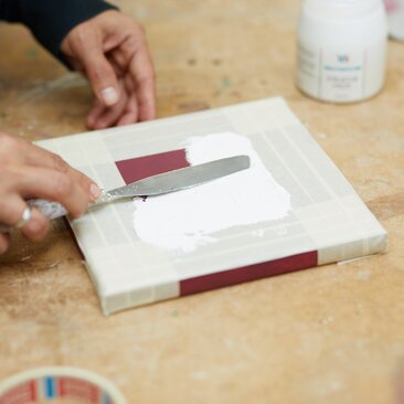 For this textured image, first prime the stretched canvas with a color of your choice. We have opted for the shade madder red-Dark here. For an intense color result, apply a second coat of paint after drying.