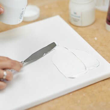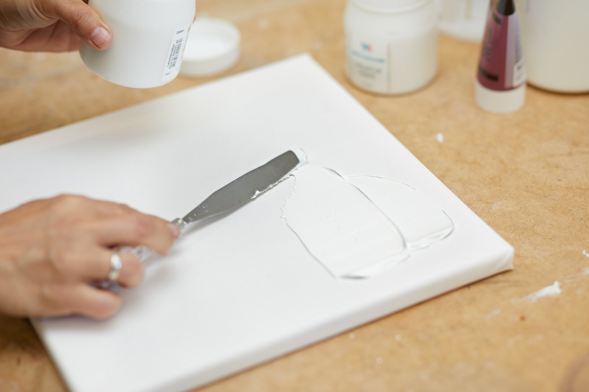 Now mix the white structure paste with a little acrylic paint and mix everything together well. We used the same color as for the background. Apply the paste generously with a palette knife to the stretched canvas so that the entire surface is covered with it.