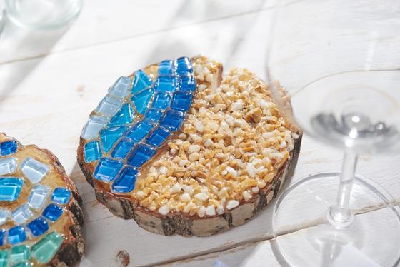 The basis for each coaster is a natural tree slice. First, select mosaic stones and place them on the tree discs.