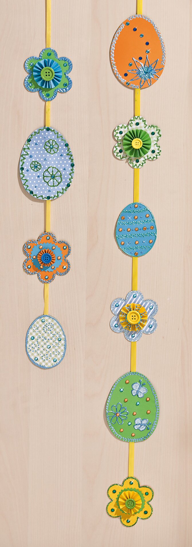 Happy garlands with colourful flowers and eggs are a great Easter decoration. Simply line up Satin ribbon the individual elements and decorate your home with them.