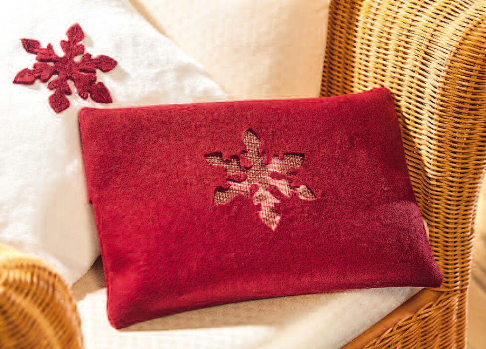 Cut off Felt sheet a 7 cm wide strip on the long side and place the remaining Felt sheet strip upright on the work surface in front of you. Then transfer the template with masking pen in the middle of the upper third and cut out the snowflake with small pointed scissors. Sew three buttons on one short side and cut the matching buttonholes on the other short side Now fold the Felt right on right to the hotel lock. Two sides of approx. 24 cm height lie on top of each other and the rest (approx. 10 cm) lies between them. Sew the two outer sides together and turn the resulting pillow over. Sew a matching ticking from the Pepita fabric, fill it with cherry stones and place it in the felt cushion. You can easily remove it at any time to warm it up in the oven or microwave. For the light-coloured cushion, cut the plush to size 100 x 43 cm and sew the short sides over. This way you get clean fabric edges that do not fray. Then fold this fabric right sides together to form a square pillowcase and sew the outer sides together. Before you put the finished ticking into the plush cover, sew the cut-out snowflake by hand.