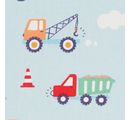 Discover the world of construction vehicles! With our Cotton fabric "Construction vehicles", you can give free rein to your creativity and design unique projects. The light blue background forms the perfect backdrop for the detailed motifs of excavators, crane trucks and mixers, which shine in bright colors in digital print.