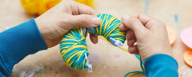 Wrap the wool around a disk template (pompon maker), secure with a woolen thread and then cut open and shape with scissors - your fluffy pompom is ready!