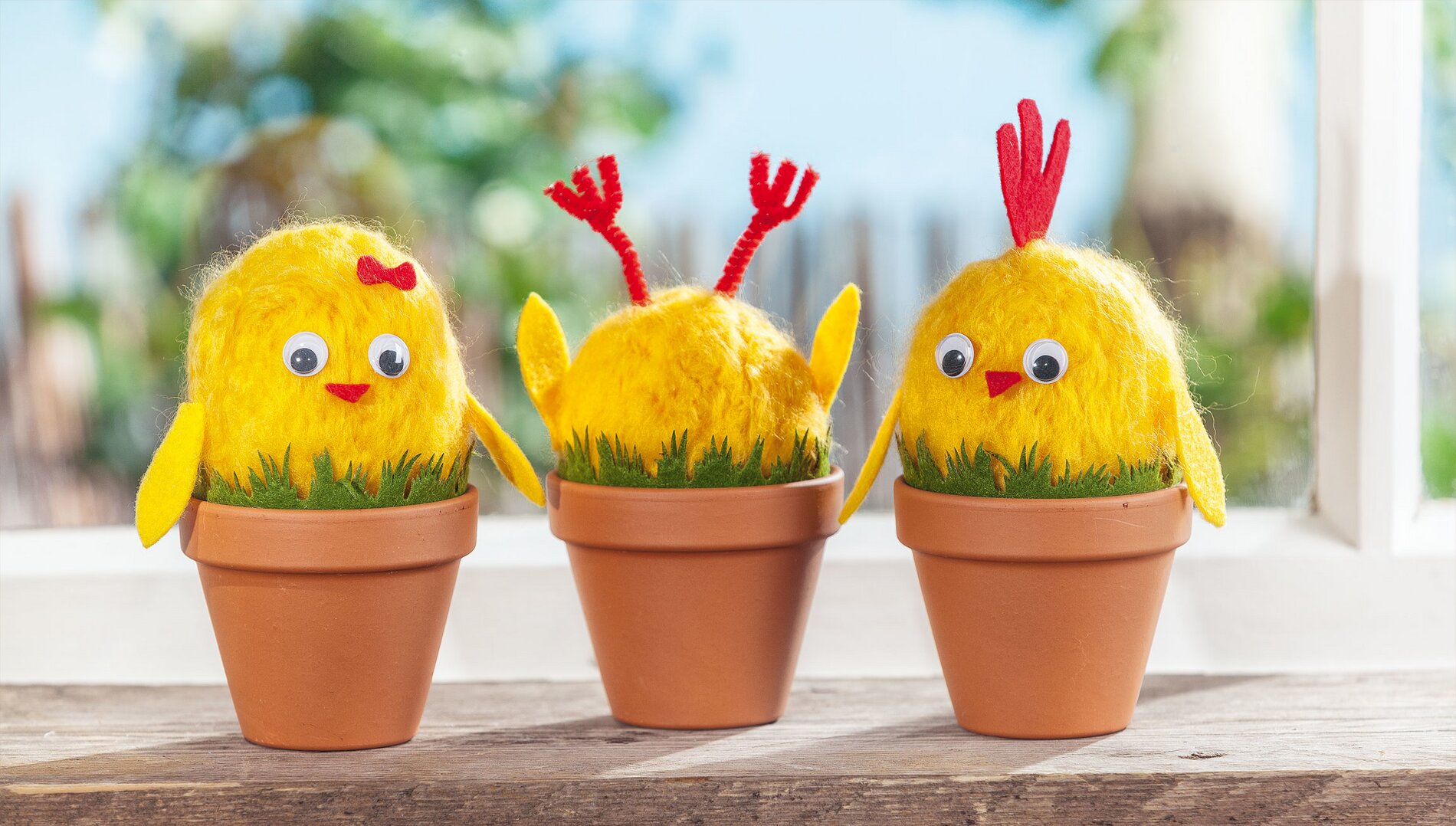 Place the chicks in small Terracotta pots (possibly also fix them with hot glue) and decorate the edge with the Felt ribbon "lawn".