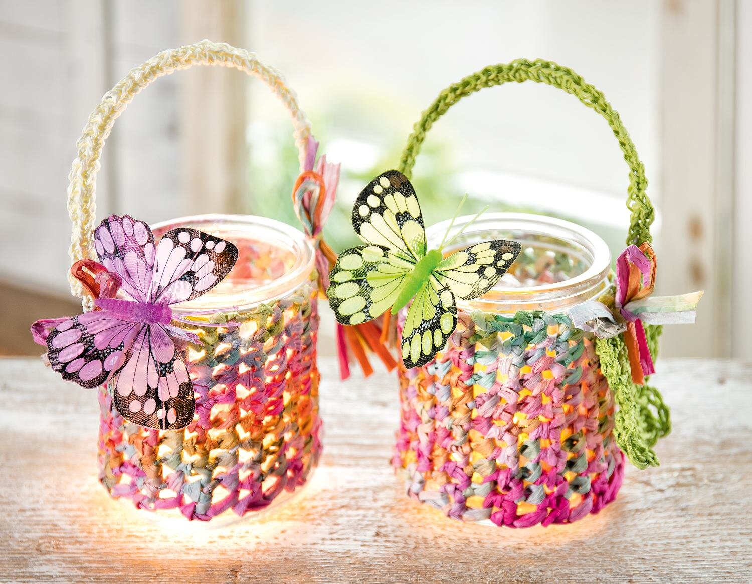 The handle of the glass lantern is then crocheted and fixed in a simple basic pattern, and finally the lantern can be decorated, for example with butterflies.