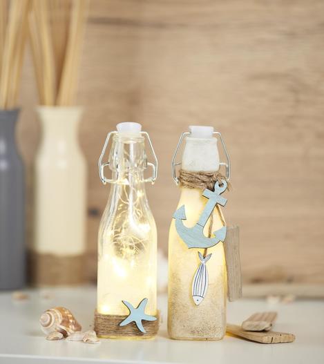 Bottle neck or bottle base are irradiated with Jute yarn wrapped and decorated with maritime accessories such as grit or flotsam further , then only will hang a chain of lights in each bottle.