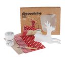 With this Décopatch Kit Mini "Reindeer" the decoration becomes very easy! The reindeer is approx. 12.5 cm long, 3.3 cm wide and 10 cm high, white primed. The Décopatch paper is 30 cm x 39 cm in size and printed with 2 different patterns. 1 sheet is Red with white dots and lines and 1 sheet with a fine wood grain.