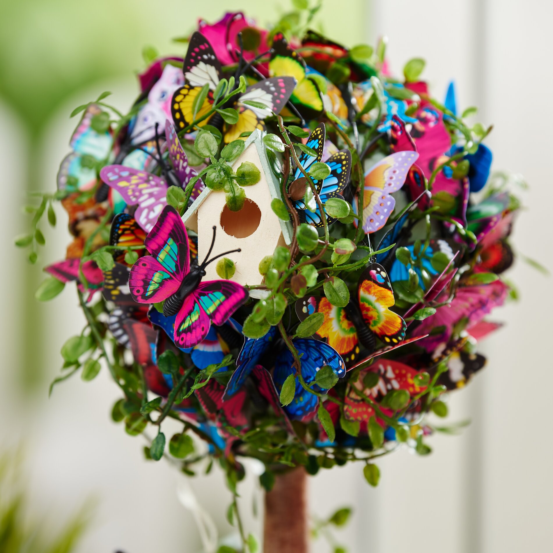 Glue the two birdhouses to the tree. Gradually attach small and large butterflies to the ball and the birdhouses and wrap everything with another garland of leaves.