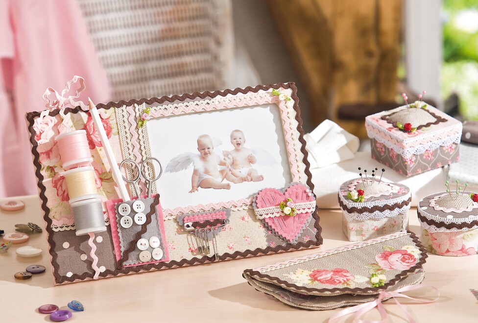Instruction frame: Put together a patchwork pattern from the different fabrics and cut the individual pieces. Spread a thin layer of wood glue on the frame, place the passepartouts on top and press well. After a short drying time, stick bobbin lace and zigzag tapes with tape between-Ribbon the blanks and decorate with satin scattered roses. Cut out different motifs from the two Felt sheets , stick them together on the frame and keep the various small parts in order: 2 hearts for sewing needles, a small pocket for scissors and 2 narrow strips for safety pins. Tie the sewing thread rolls to the picture-Ribbon frame with zig-zag, attach buttons Needles, etc. to the felt elements.