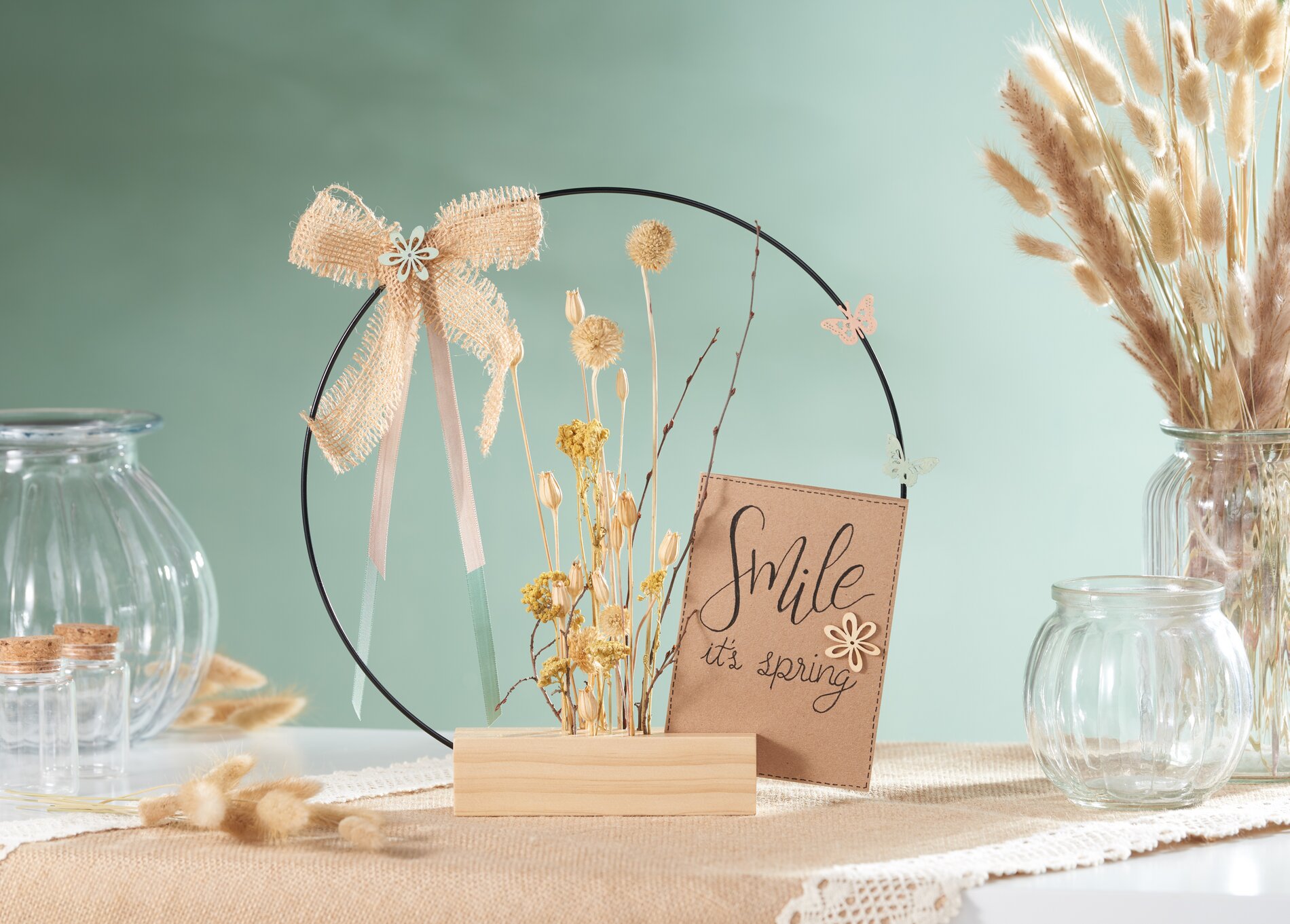First take the jute and the taffeta ribbon so that you can knot them to the metal ring. Here you can tie and arrange the ribbons individually. The decorative ring can then be inserted into the wooden stand. When the decorative ring is firmly in place, you can next shorten the desired dried flowers accordingly and insert them into the existing holes.
