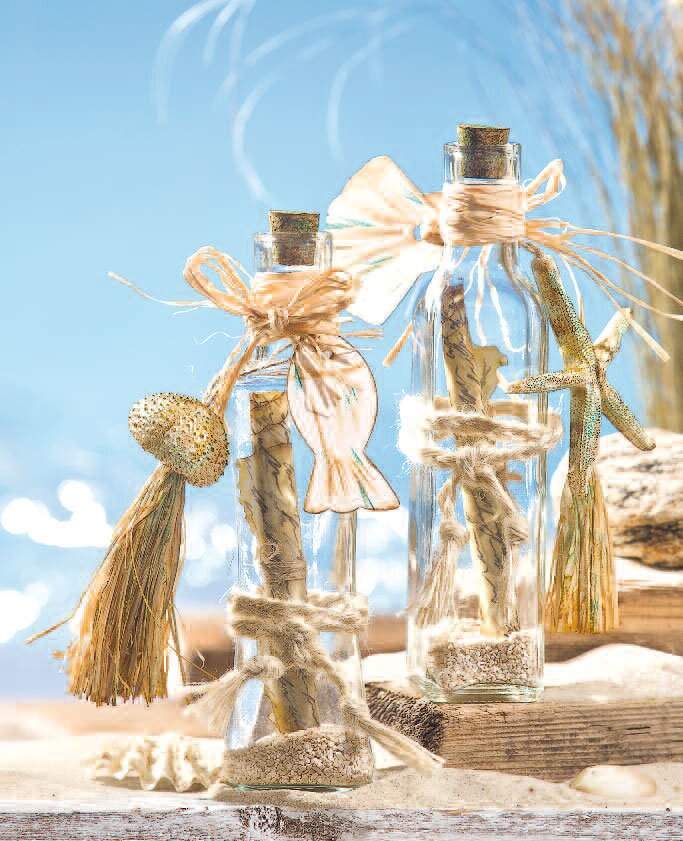 Now fill something Sand or pearl gravel and some shells into the bottles and put the paper roll inside.