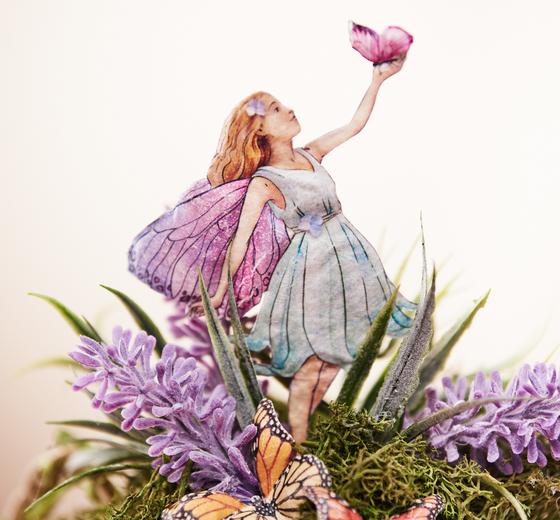The cut-out motifs, such as butterflies and a fairy, are now glued onto the moss glued on. You can attach a bamboo skewer to the back to hold the fairy in place. Complete the lid by adding more lavender picks.