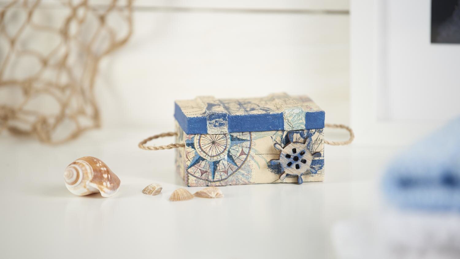Paint the sides of the lid of the chest with Handicraft paint in Navy blue Leave out the struts. Finally, decorate the treasure chest with a