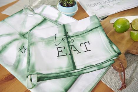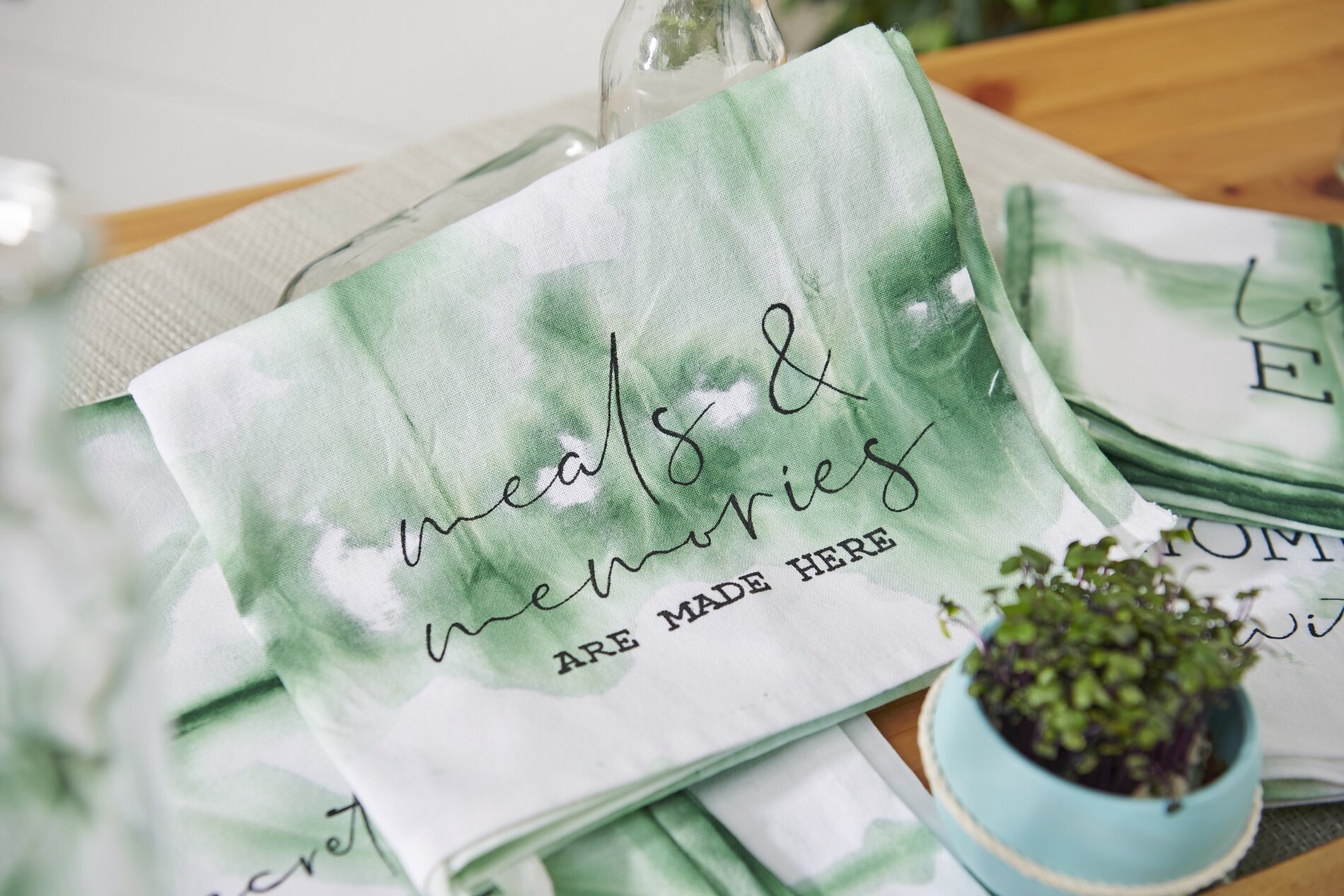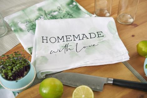 Add a beautiful splash of colour to your kitchen with coloured kitchen towels. The cotton kitchen towels were folded and tied. They were then designed with textile paint and decorated with beautiful lettering. Perfect as a housewarming gift or for people who love to cook.