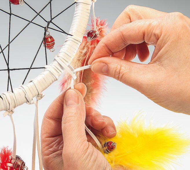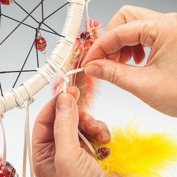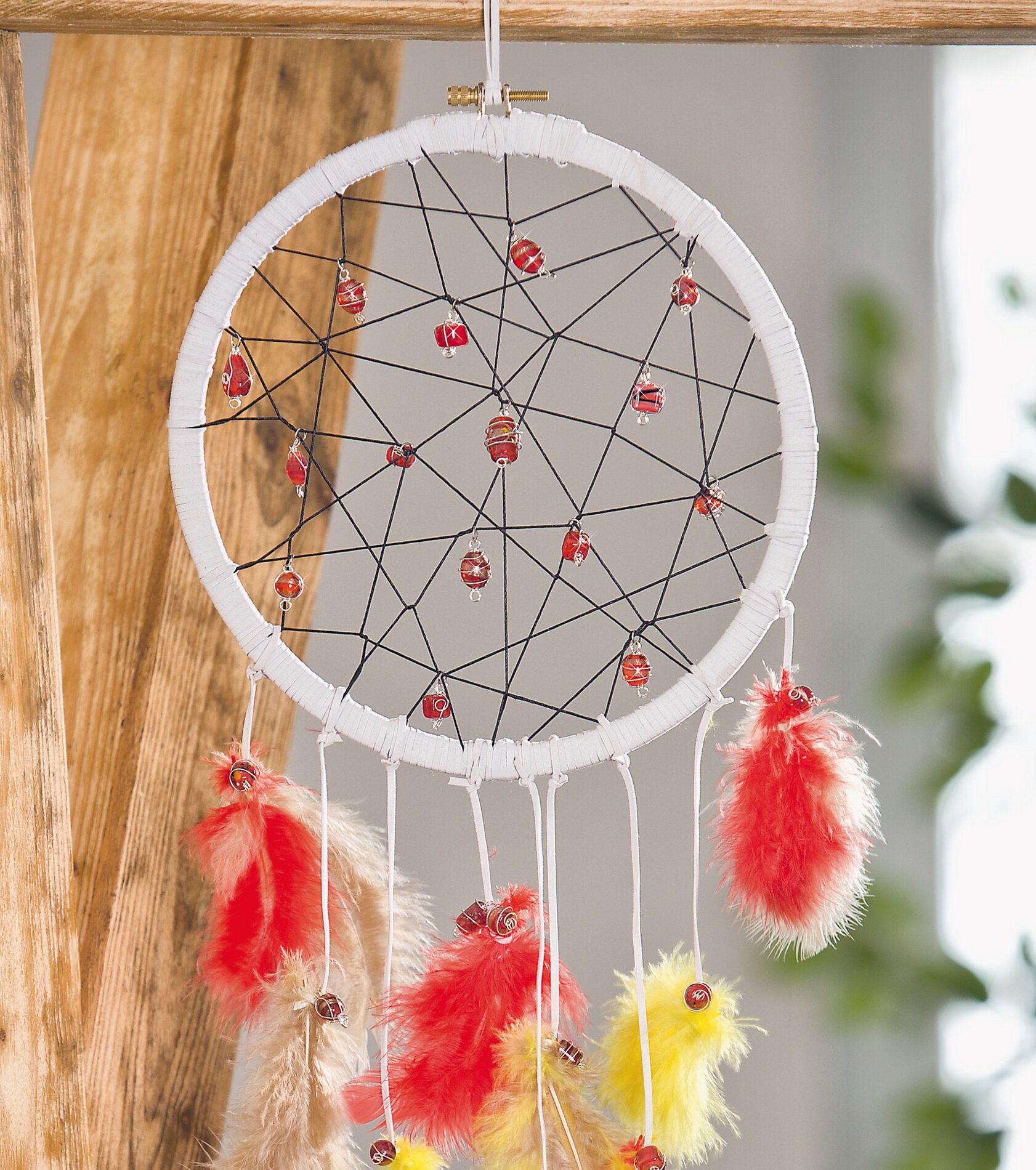 A stable embroidery ring forms the framework for this modern dream catcher. Wrapped in white and designed with and Feathers in Glass beads bright colours, it will certainly bring you a relaxed sleep and sweet dreams