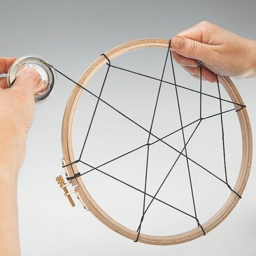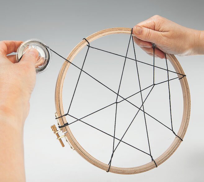 Knot the jewellery cord firmly to the embroidery ring and stretch it to the opposite side. Wrap it around the ring Cord once