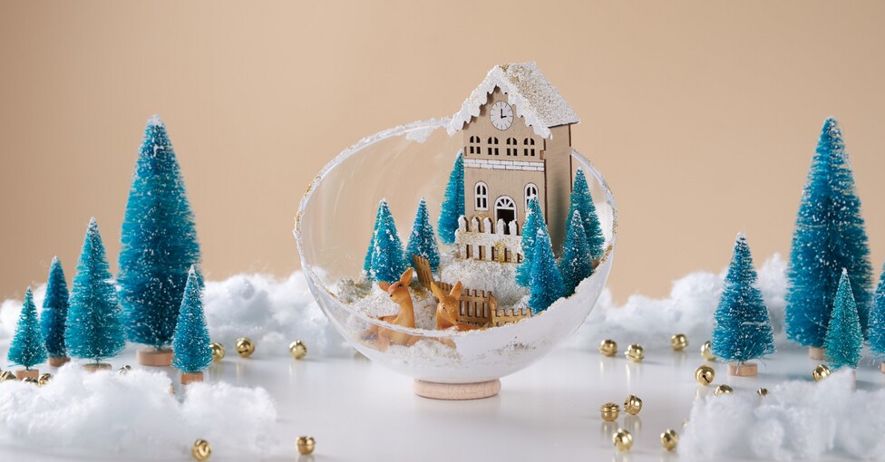 The snow landscape, house and accessories are arranged in an acrylic ball in this idea.
