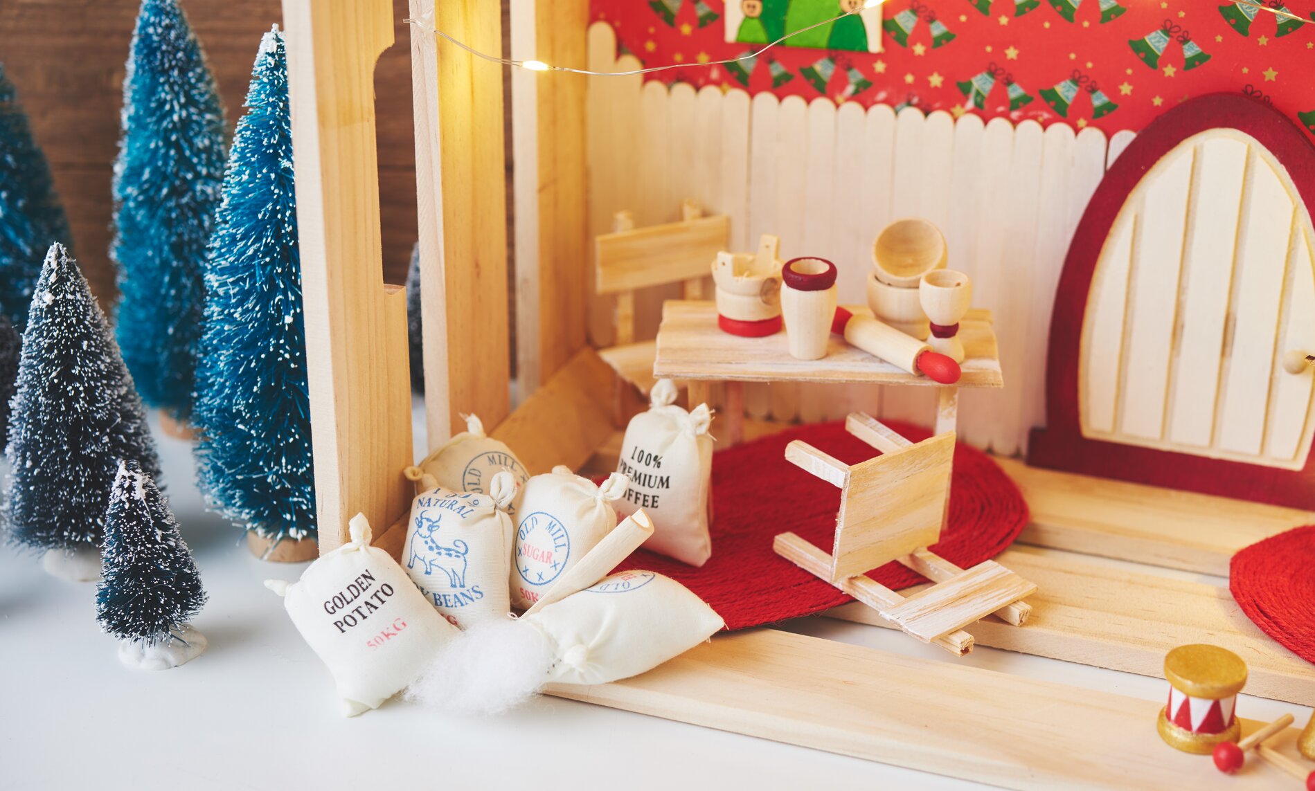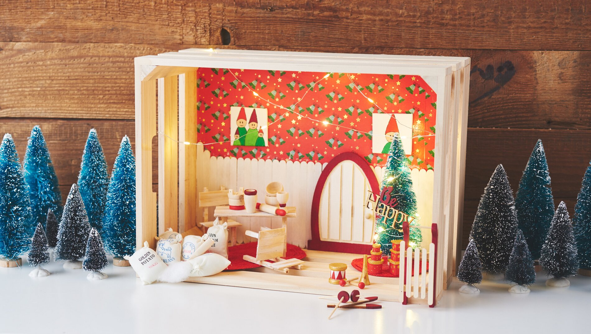 A wall panel is made from wooden sticks, miniature painting boards are turned into small wall pictures. Paint the wooden sticks with white paint, give the Secret Santa door and the many small accessories a Christmassy look with white, aubergine and a little gold paint. With a little paint, you can also create little gnome murals on the painting boards.
