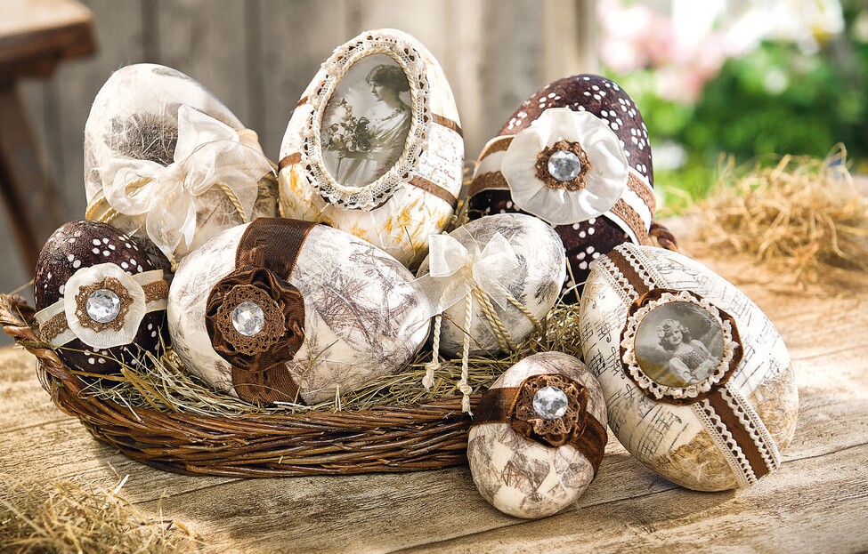 Each of these country style eggs is a small work of art. With the nostalgic photos and the elegant rosettes they look very elegant. They are all designed with the same simple basic technique, which is slightly varied in each case only It is important that the individual pieces of paper that are glued on are not too large, otherwise too many folds will be created when gluing on. But Straw silk paper and Co. can be torn wonderfully and are thus wonderfully suitable for this handicraft work.