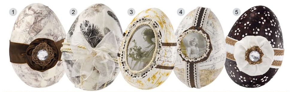 5. The "Flower Nature" egg Cut the Natural paper into small pieces and glue it on with Napkins lack. After drying, glue the Acetate ribbon and the tip around the egg. Cut a circle Ø 4 cm out of cardboard, fix the Acetate ribbon in frills with hot glue. Glue on a gemstone and lace, stick the finished rosette in the middle of the border.