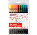 The edding 1340 "Brush Lettering" set contains 10 gentle colours with a flexible brush tip. Ideal for creative lettering and drawings on light-coloured Paper. paper. Can also be used for colouring stamps. The colours do not penetrate through the Paper ink. It Ink is water-based and lightfast.