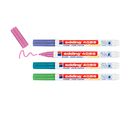 The edding 4085 Chalk marker set of 4 with harmoniously coordinated colours for non-permanent labelling on smooth surfaces such as dark chalkboards, glass, window panes and mirrors. The fine bullet tip with a line width of approx. 1 - 2 mm enables precise labelling. The liquid chalk can be wiped off with a damp cloth.
