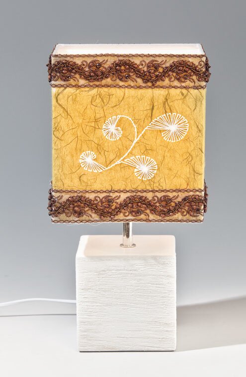 Lampshade Lay the pattern for the thread graphic on top of the tape, prick the pattern with the prickle needle and embroider with pearl thread. Glue the thread ends on the inside.