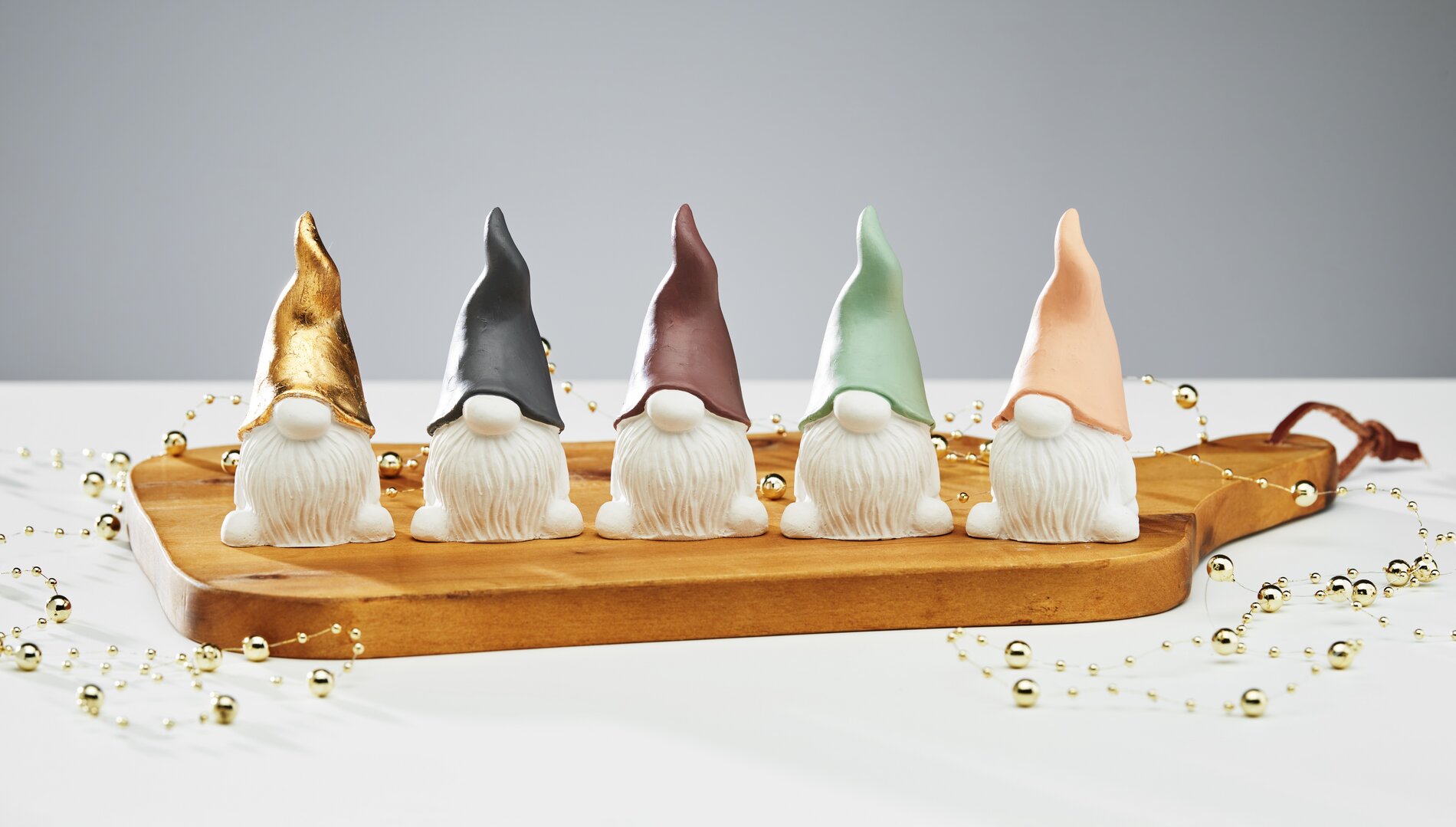 For the gnome with the golden hat: Apply the pasty gold leaf priming milk with a brush and leave to dry until transparent. This takes approx. 20 minutes. Now apply leaf metal and press it on carefully with the synthetic brush.