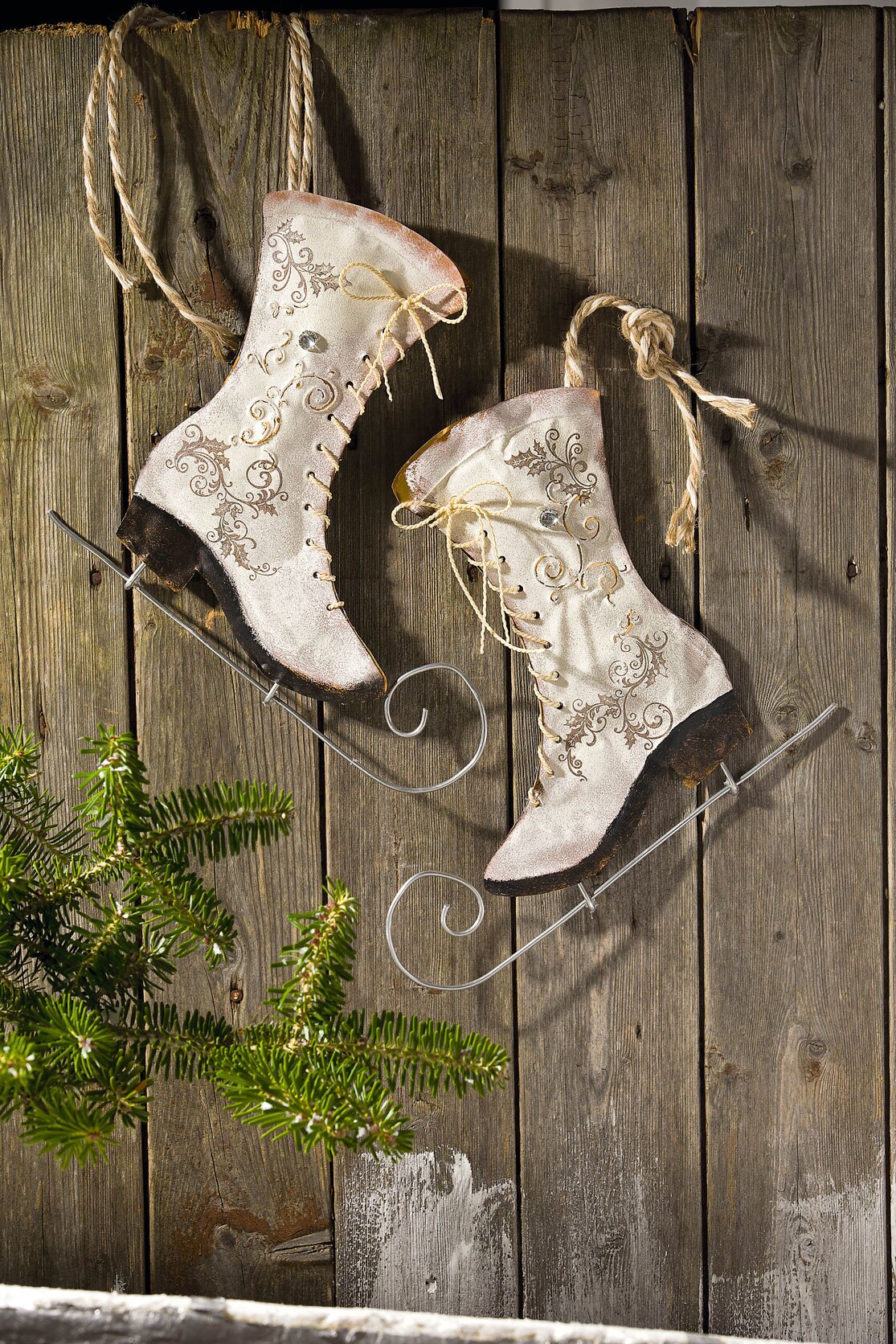 Glue two boots to each other with hot-melt adhesive, placing two short aluminium wires between the heel and ball of the foot and fixing a suspension from the glitter cord at the top.