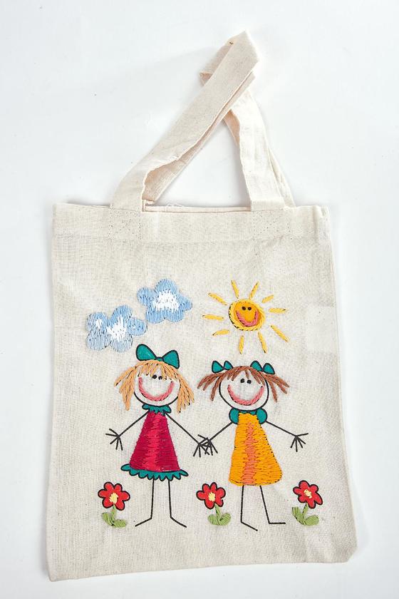 Colour in individual areas that are not to be embroidered (e.g. hair Sun, ribbons, flowers) with the fabric colours.