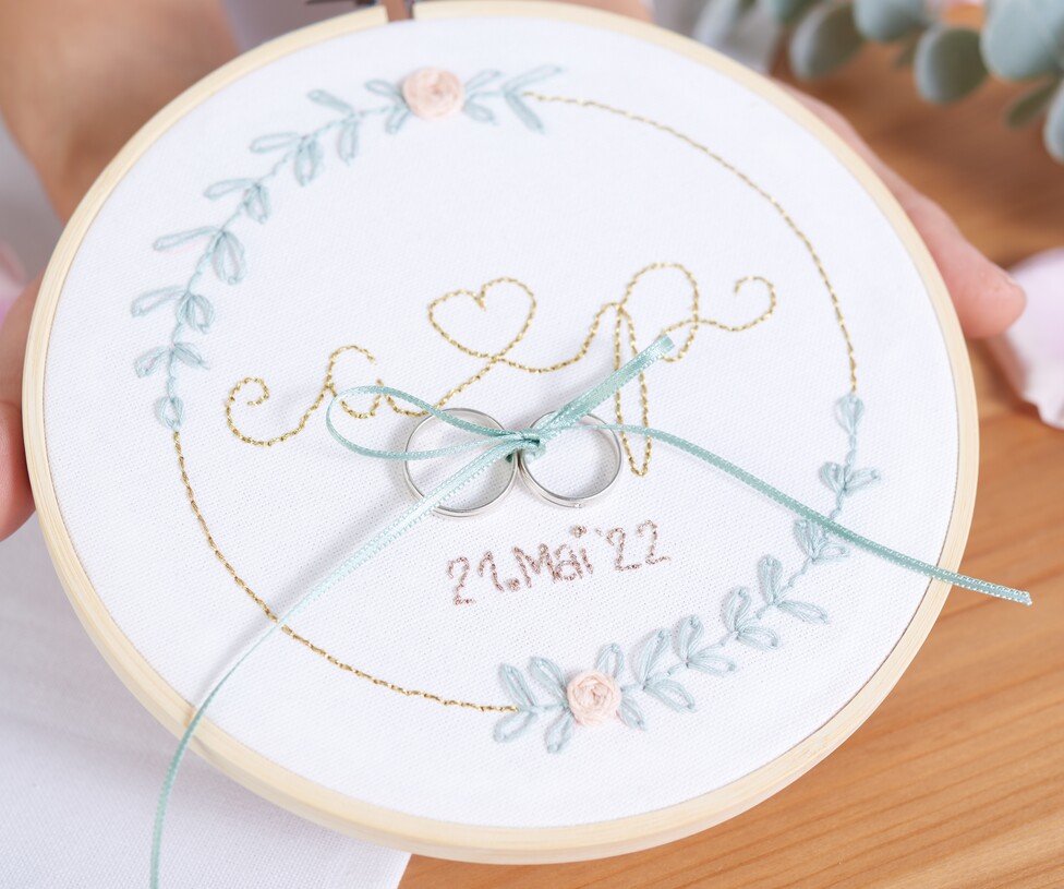 Of course, the rings can't be missing from a wedding. Instead of a traditional ring cushion, you can also use this beautiful idea with the embroidery ring as a ring storage and then use it as a personalised keepsake. Let your day be something special.