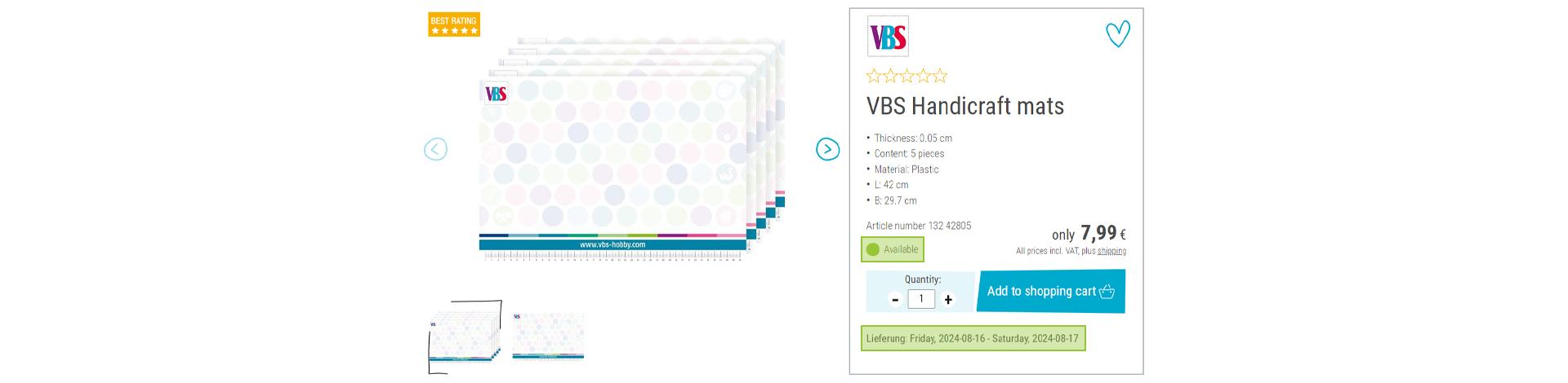 From a value of goods of € 75,00 we send you yours free of charge Order within Germany. For orders with a value of goods below € 75,00 we charge € 6,25 for postage, shipping and packaging per order Order. VBS the shipping costs. Further costs or surcharges, e.g. for bulky goods etc. are available from VBS not. The shipping costs will be Order displayed before you submit your order.