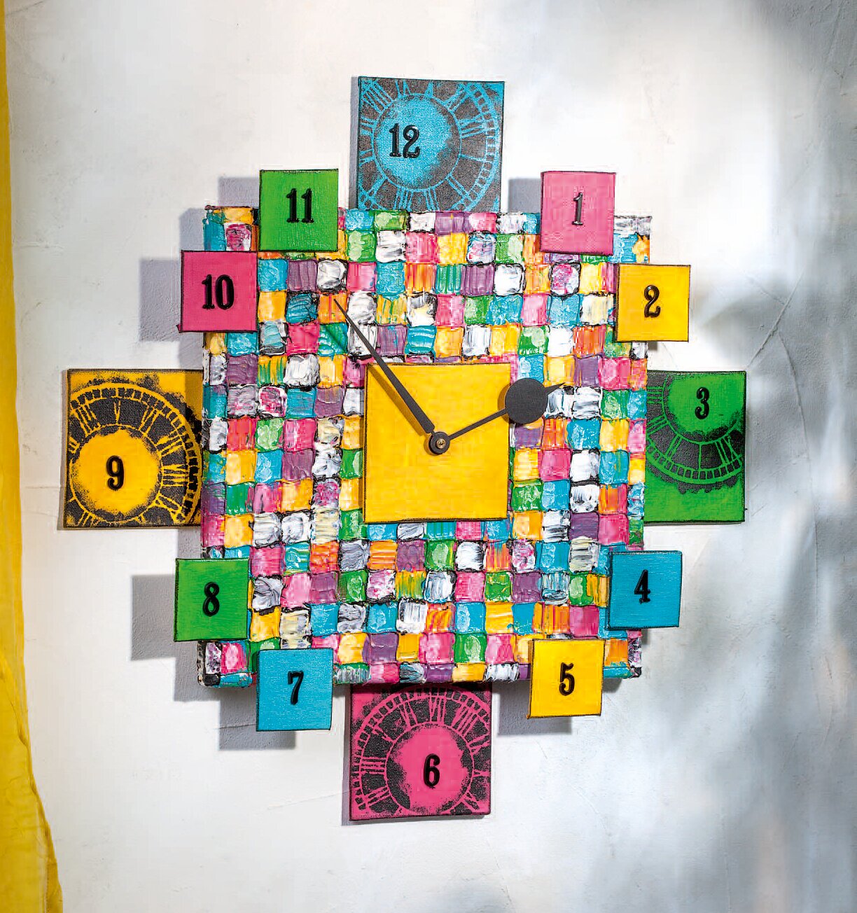 First apply all colours except white richly into the individual fields of the Quadratologo stretcher frame. Use the white to lighten individual fields - especially the black ones