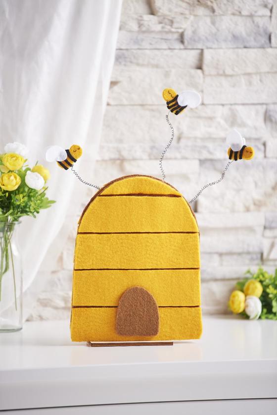 The small bees are made of yellow felt cloth. Stick small black stripes on the yellow blanks, then white wings. Paint the eyes with a black Marker on