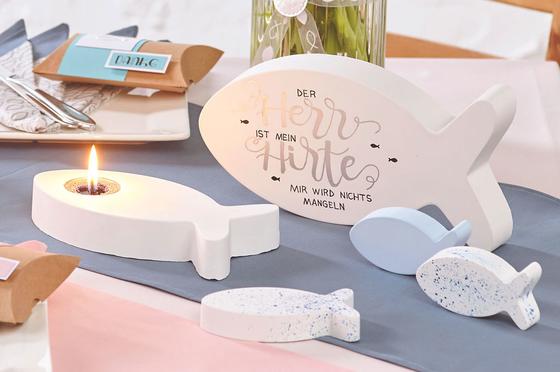 Stick fish accessories (orHandicraft glue hot glue) on the tealight glasses Cube and fill them with a candle wick and candle sand in and white.