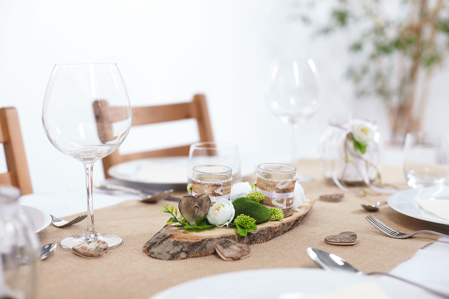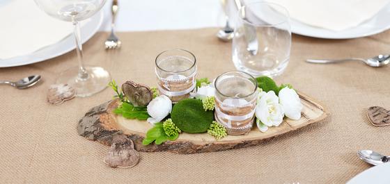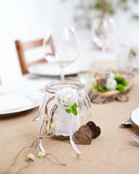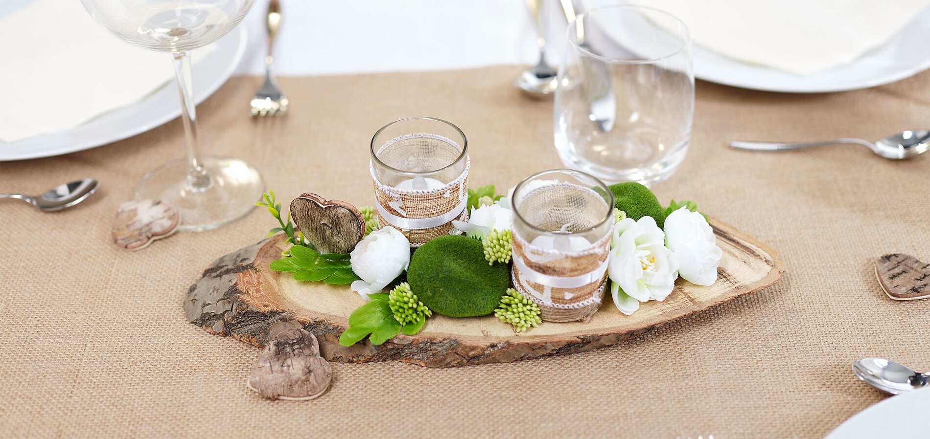 Place a LED tea light in each glass. Arrange the tea light glasses with ranunculus, moss stones and wild berry flowers on the tree disc. Fix everything with hot glue. Small Embellishment "hearts" complete the decoration.