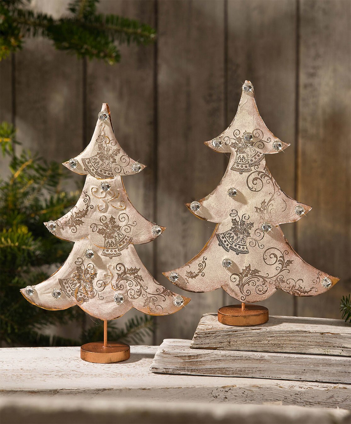 how it works  First prime the round bar and Wooden discs copper colored. Then use the template to make a Stencil and cut out four fir trees from the aluminium sheet. Dab antique white Handicraft paint.