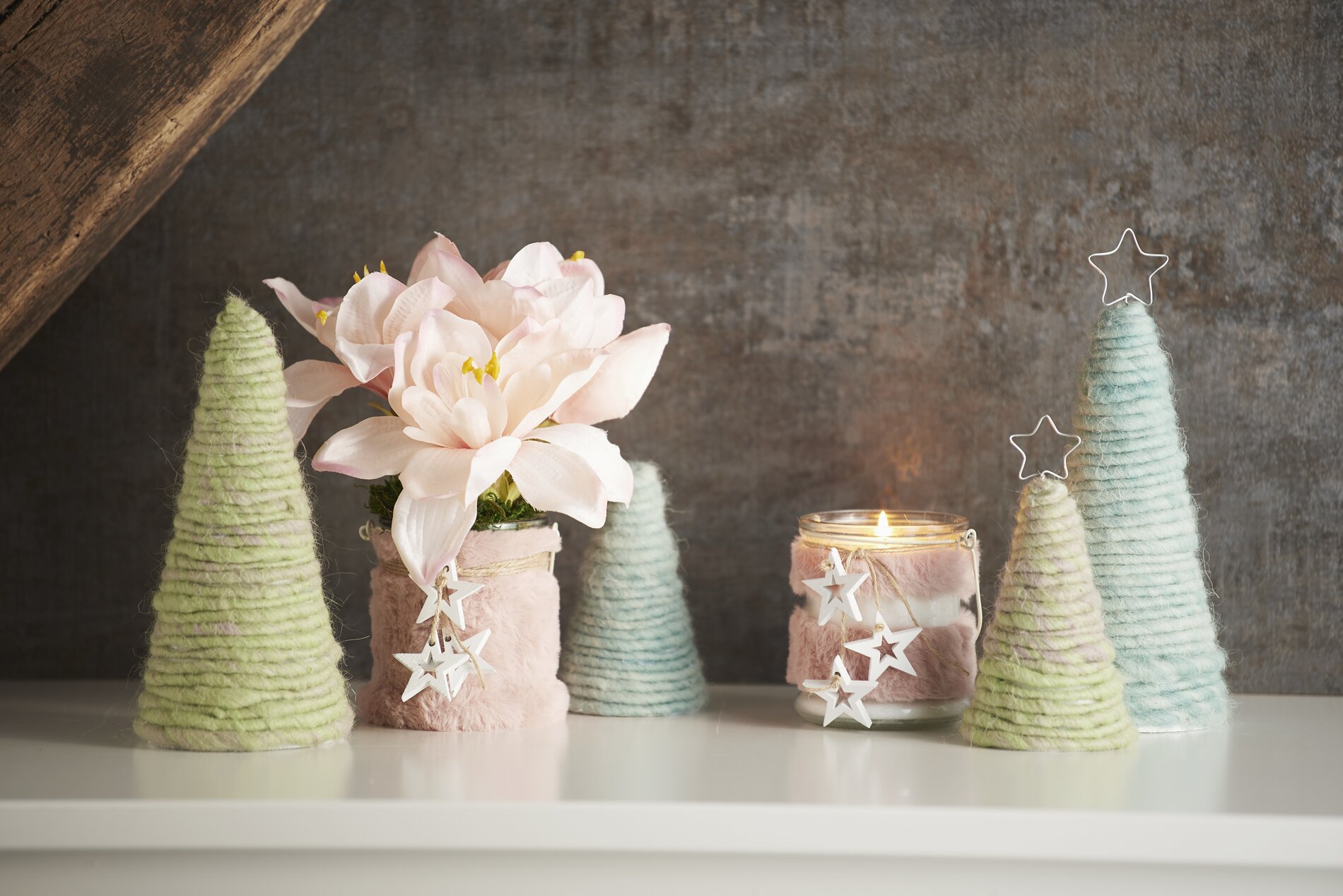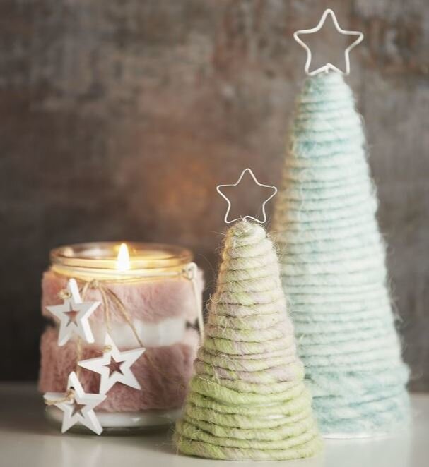 First of all, take a Polystyrene cone in the desired size at hand. Make a glue dot with hot glue at the bottom of Polystyrene cone and start to wrap the wool cord around the cone. You should fix the string with hot glue in places to prevent it from slipping away later. In this way you can design the styrofoam pans in different sizes. Finally, a star is formed from silver wire, which should decorate the top of the Fir