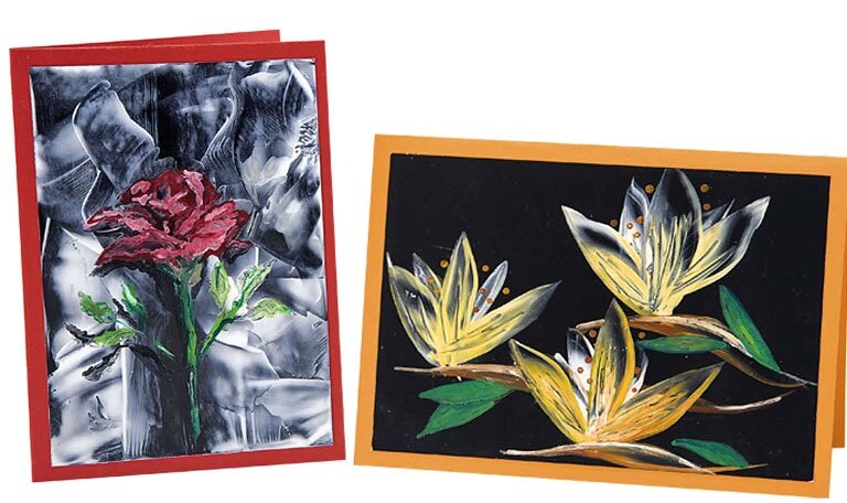 These greeting cards were designed on black painting cards. The brilliant wax colors look even more radiant. With a little practice you can create valuable and unique greeting cards on suitable double cards, which will leave a lasting impression on the recipient.